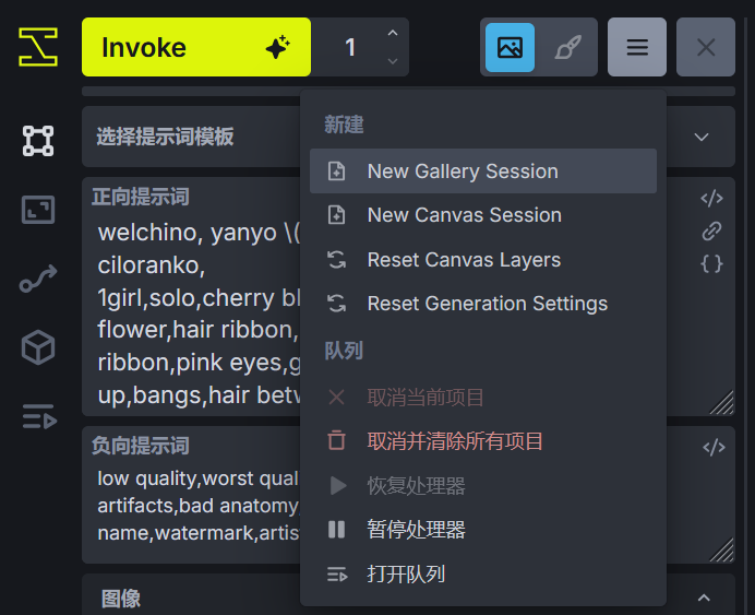左上角为 InvokeAI 的生成选项,点击 Invoke 按钮可以进行图片生成,如果该按钮为灰色,可以将鼠标移到按钮上,InvokeAI 将展示哪些参数不满足生成的要求并根据提示进行修改。如果需要生成多张图片,可以多次点击 Invoke 按钮。