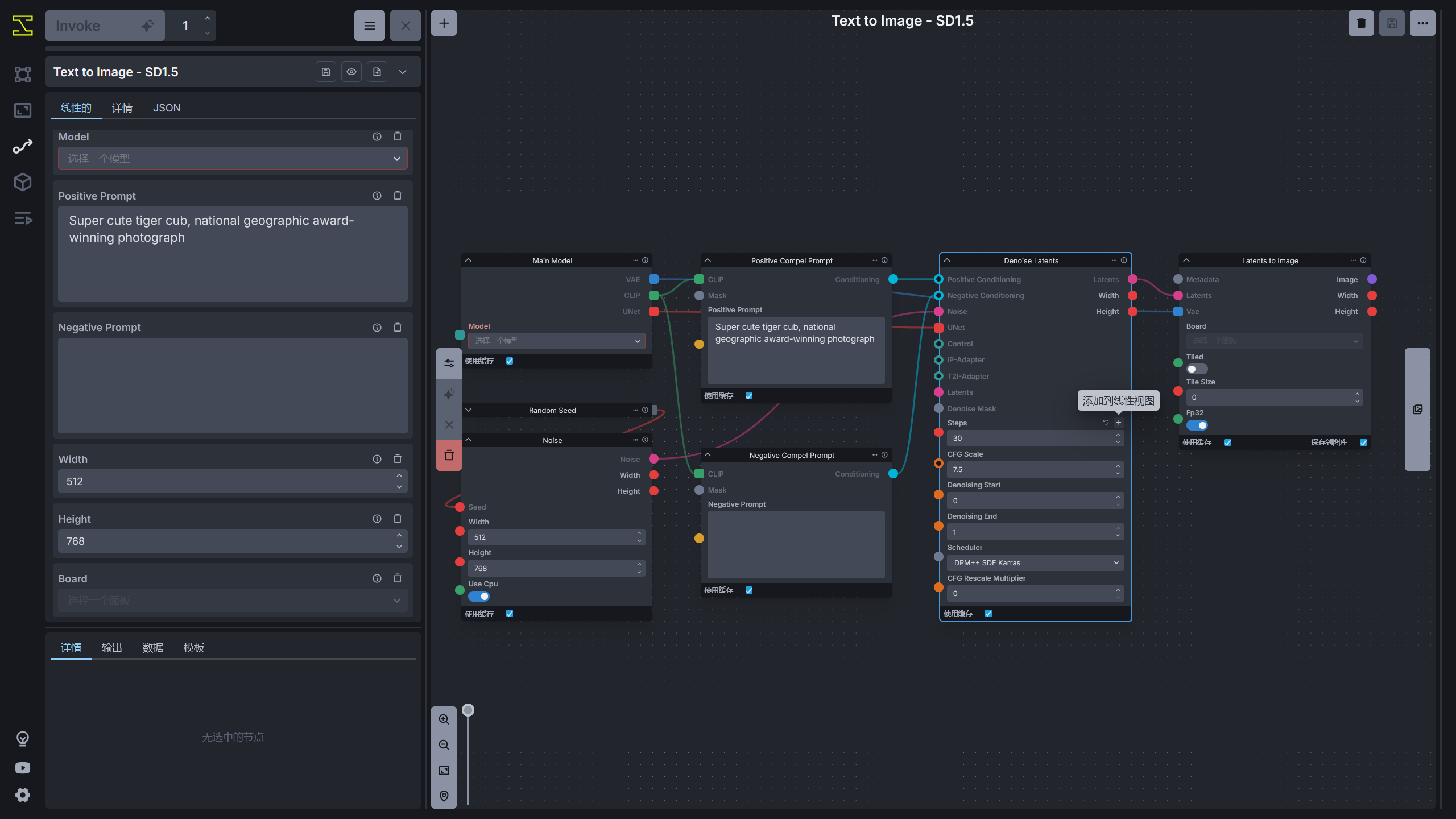 如果工作流中某些参数经常需要调整,可以将参数添加到线性视图中,在参数的右上角点击 + 号即可添加。