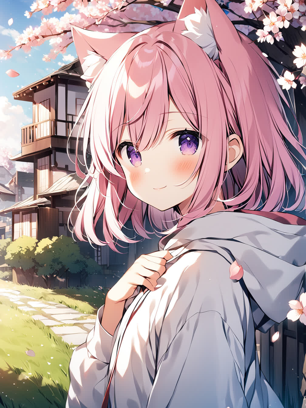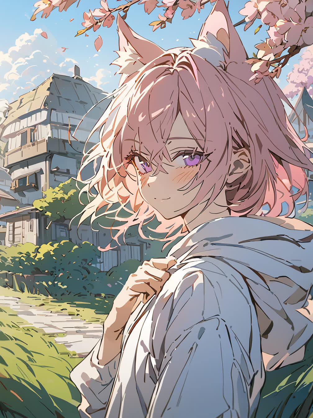 quansarcake,hxxg,chiaroscuro,atdan, 1girl,animal ears,animal ear fluff,cat ears,pink hair,short hair,bangs,blush,closed mouth,light smile,purple eyes,hair between eyes,white hoodie,flat chest, looking at viewer,under the tree,hand on own chest,fist, landscape,grass,flower,blue sky,cirrocumulus,moody lighting,sunlight,day,building,house,path,wind,cherry blossoms tree,falling petals, close-up,upper body,from side,