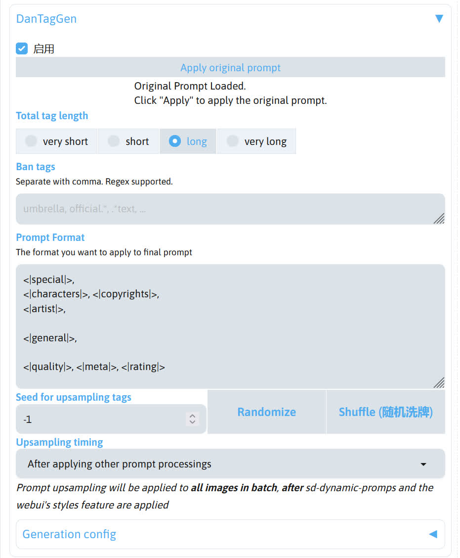 如果对提示词不熟悉,但又想抽出比较好的图,可以试试 z-a1111-sd-webui-dtg 扩展,启用后就可以快乐的抽卡了。