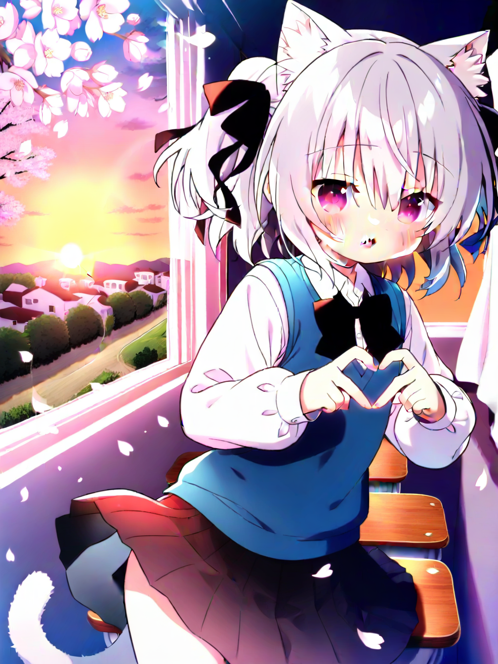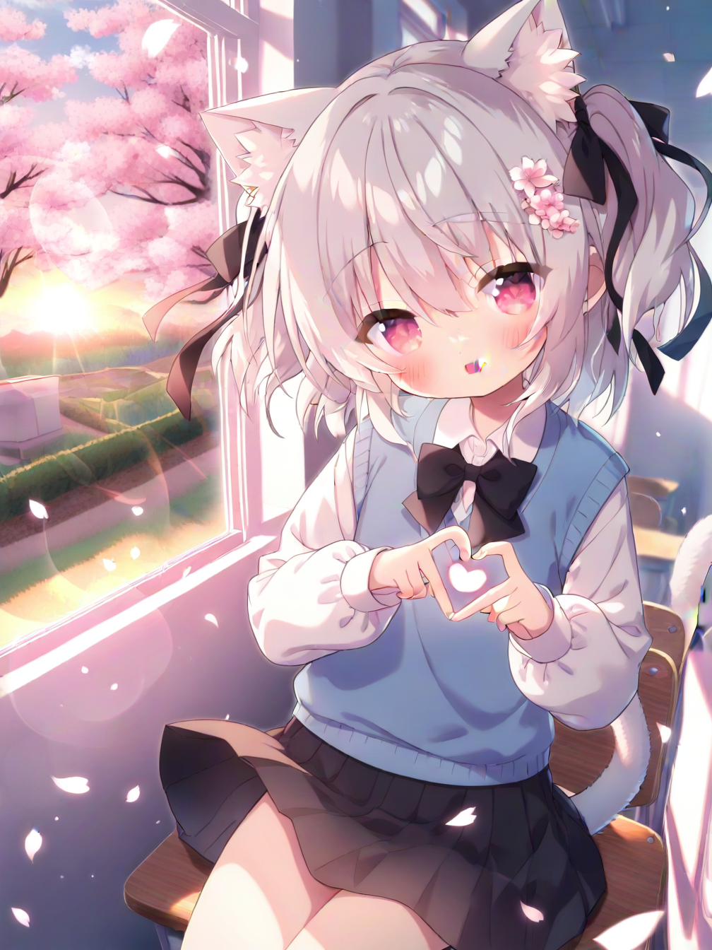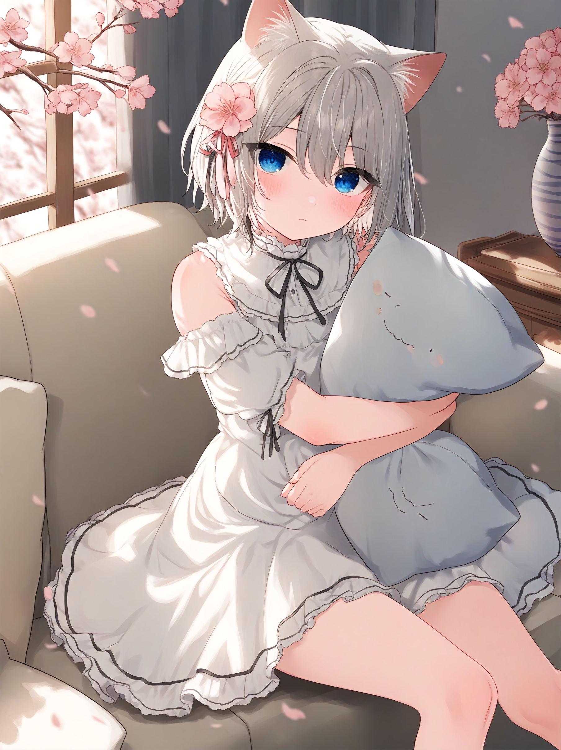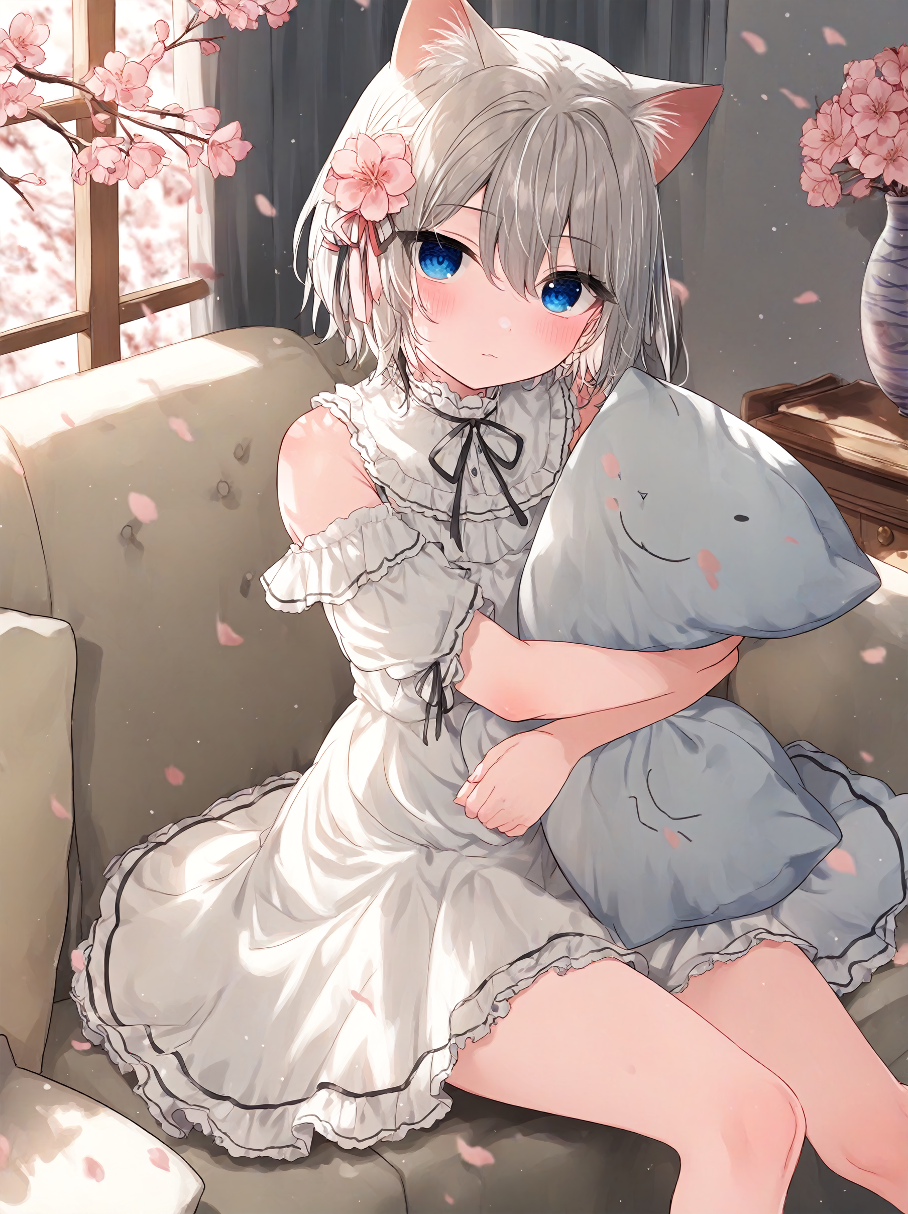 1girl,solo,cherry blossoms,hair flower,pink flower,hair ribbon,cat ears,animal ear fluff,grey hair,short hair,bangs,blue eyes,hair between eyes,eyebrows visible through hair,blush,neck ribbon,white dress,frilled collar,medium dress,petticoat,detached sleeves,flat chest,