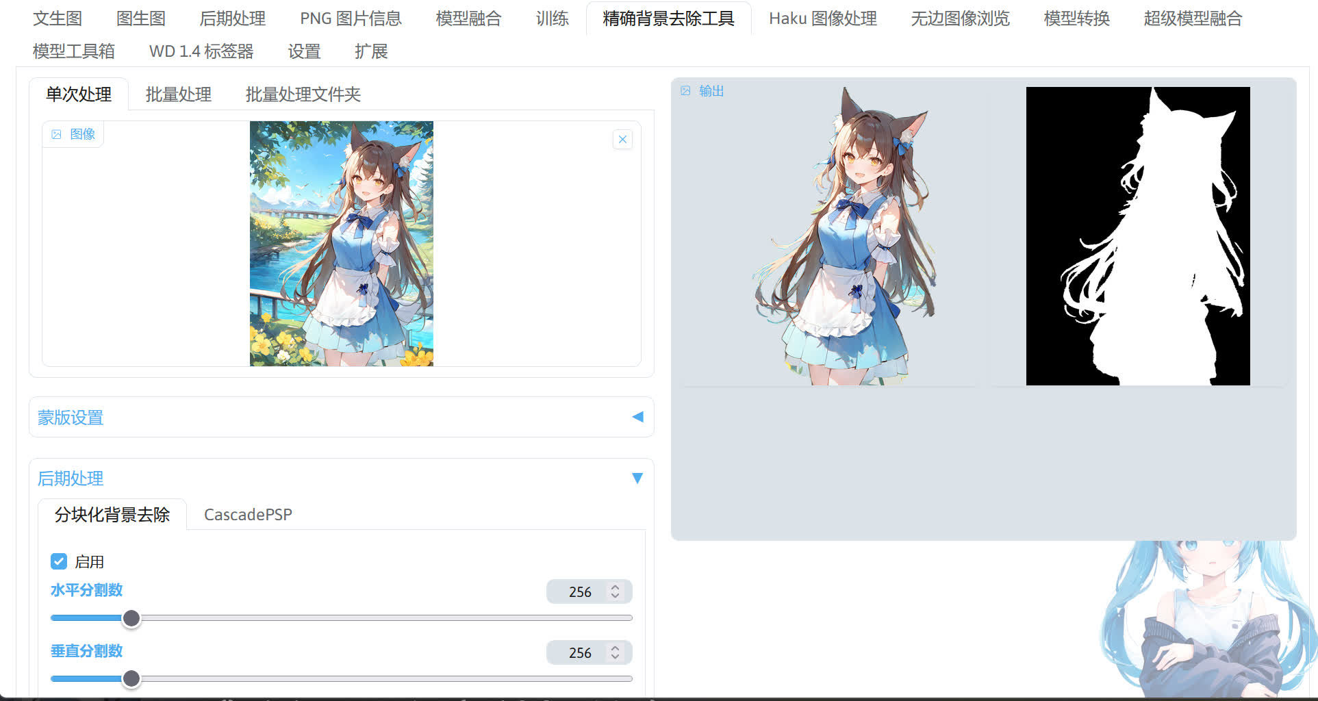 如果有生成蒙版的需求,可以使用 PBRemTools 扩展。在精准背景移除工具选项卡中,导入要移除背景的图片,在后期处理的选项中点击启用,再点提交,这样就可以生成一张移除背景的图片和蒙版。