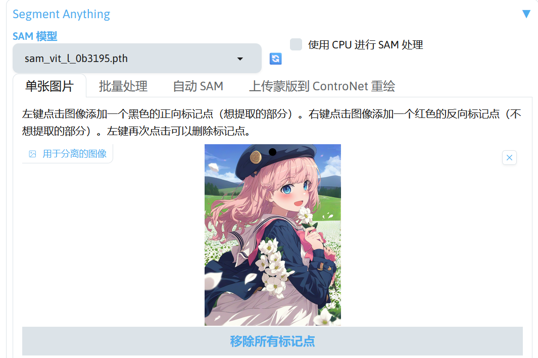 然后在 SAM 模型选项选择 mobile_sam.pt 模型,再点击预览分离结果处理图片,处理完成后得到以下结果。