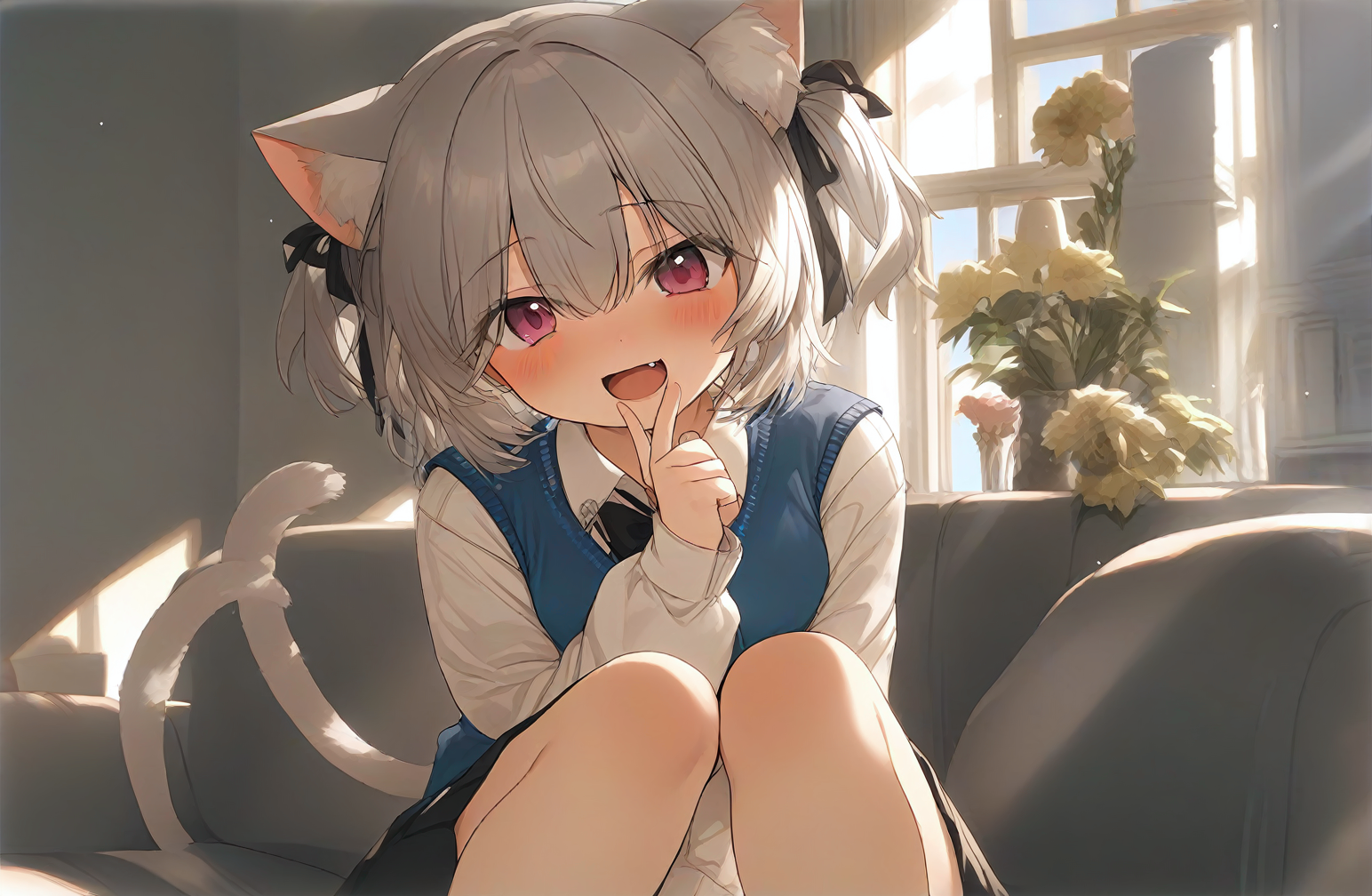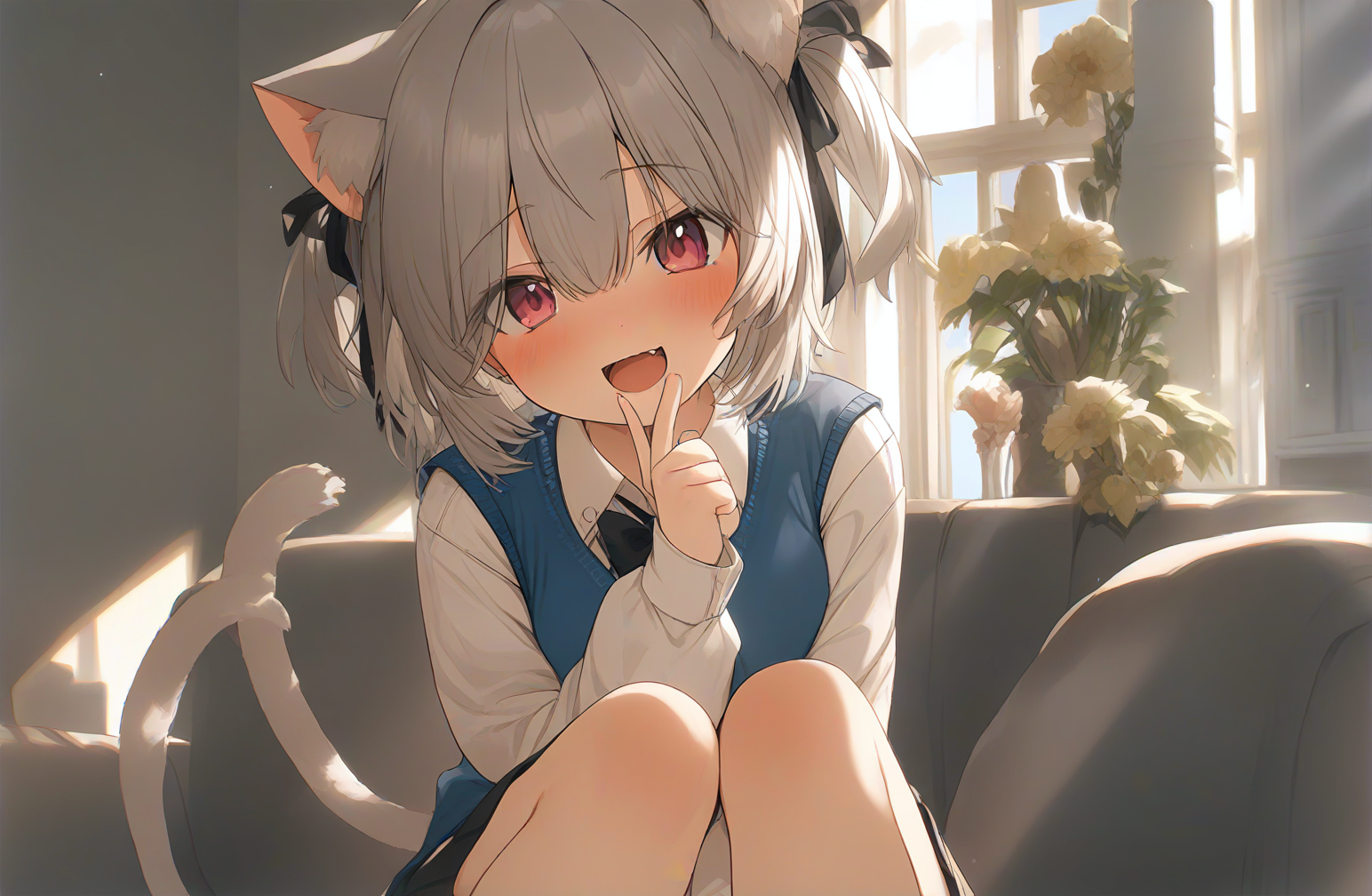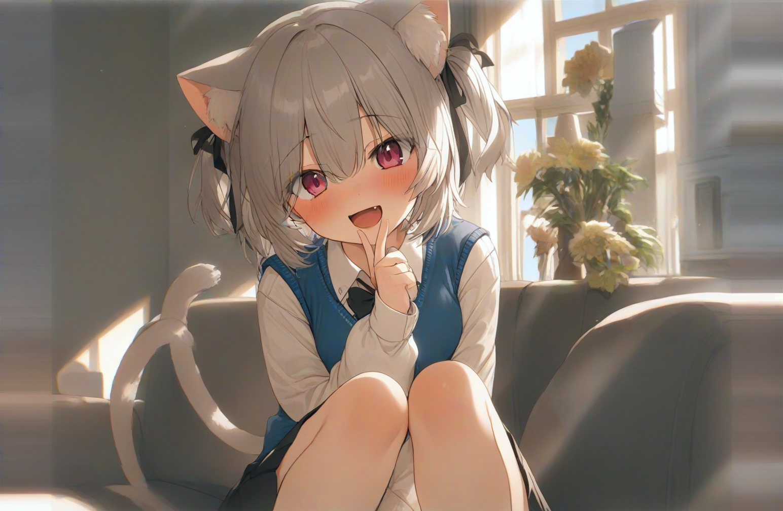 1girl,solo,cat ears,animal ear fluff,hair ribbon,pink eyes,grey hair,short hair,two side up,bangs,hair between eyes,eyebrows visible through hair,blush,fang,long sleeves,bow,white shirt,puffy sleeves,collared shirt,sleeves past wrists,black bow,puffy long sleeves,blue vest,sweater vest,pleated skirt,black skirt,cat tail,