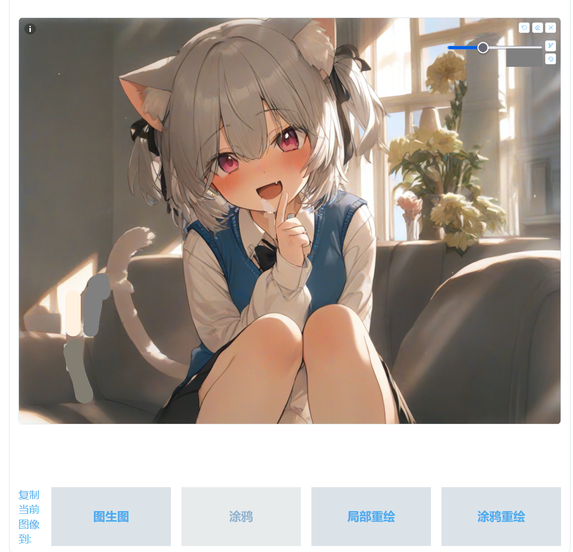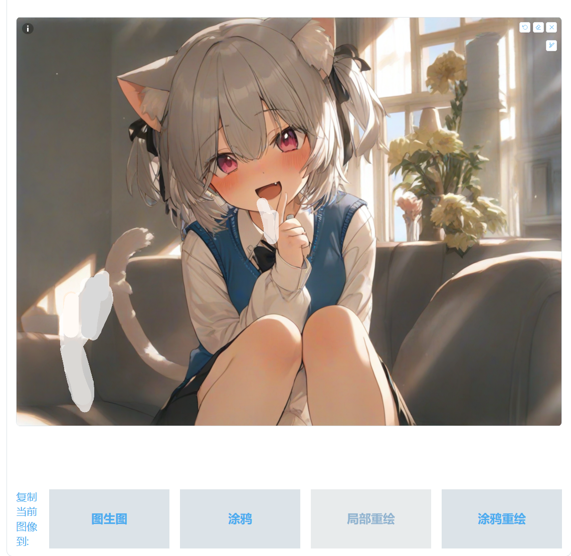 这里涂鸦已经变成一张比较好看的图片,但是想对图片添加一些元素,就可以点击图片预览界面下方的 🖼️ 将生成的图片发送值图生图,在图生图画布下面点击复制当前图像到局部重绘。