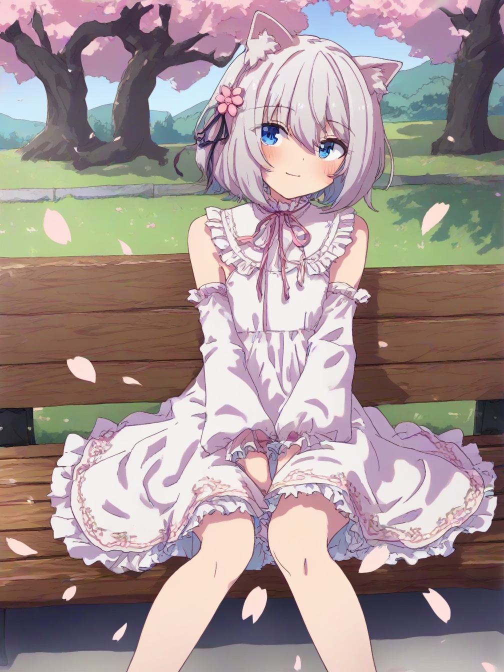 1girl,solo,cherry blossoms,hair flower,pink flower,hair ribbon,cat ears,animal ear fluff,grey hair,short hair,bangs,blue eyes,hair between eyes,eyebrows visible through hair,blush,neck ribbon,white dress,frilled collar,medium dress,petticoat,detached sleeves,flat chest,