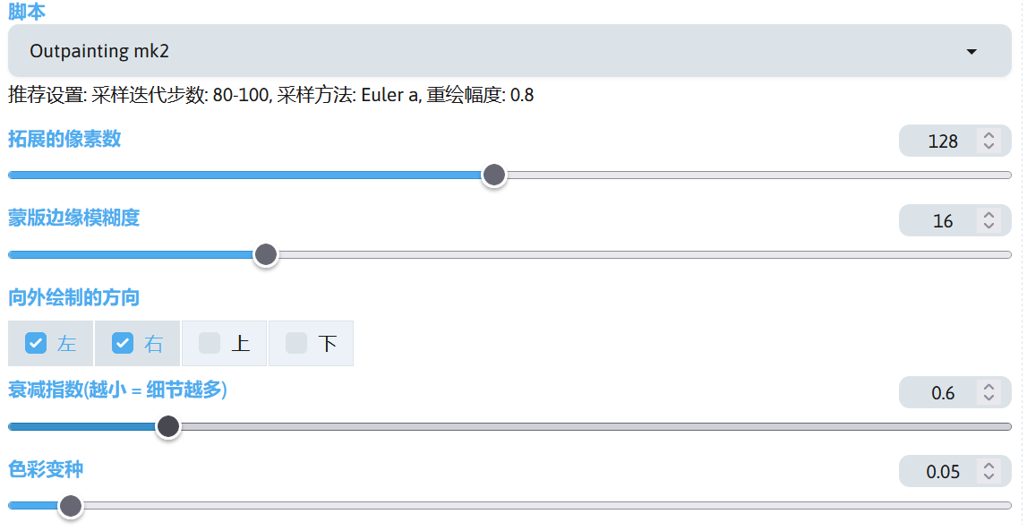 | 衰减指数 | 在外扩区域,脚本先填充色块,再为外扩区域绘制重绘蒙版。该值用于设置色块的细腻度,值越低,色块越细,外扩时细节更多。 |
