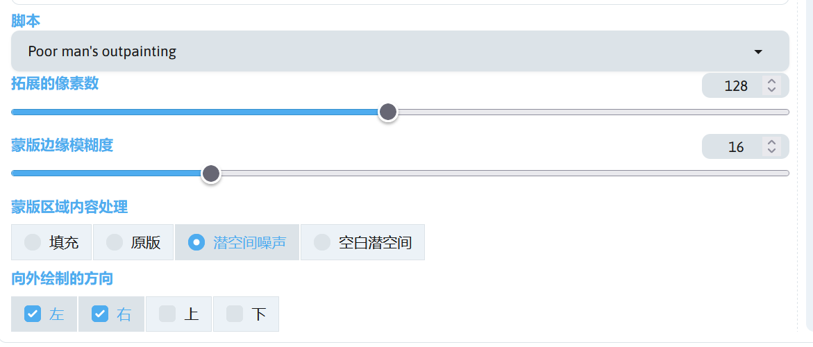 该脚本可以更换蒙版区域内容处理,通过更换蒙版内容处理方式可以更好的达到想要的外扩效果。