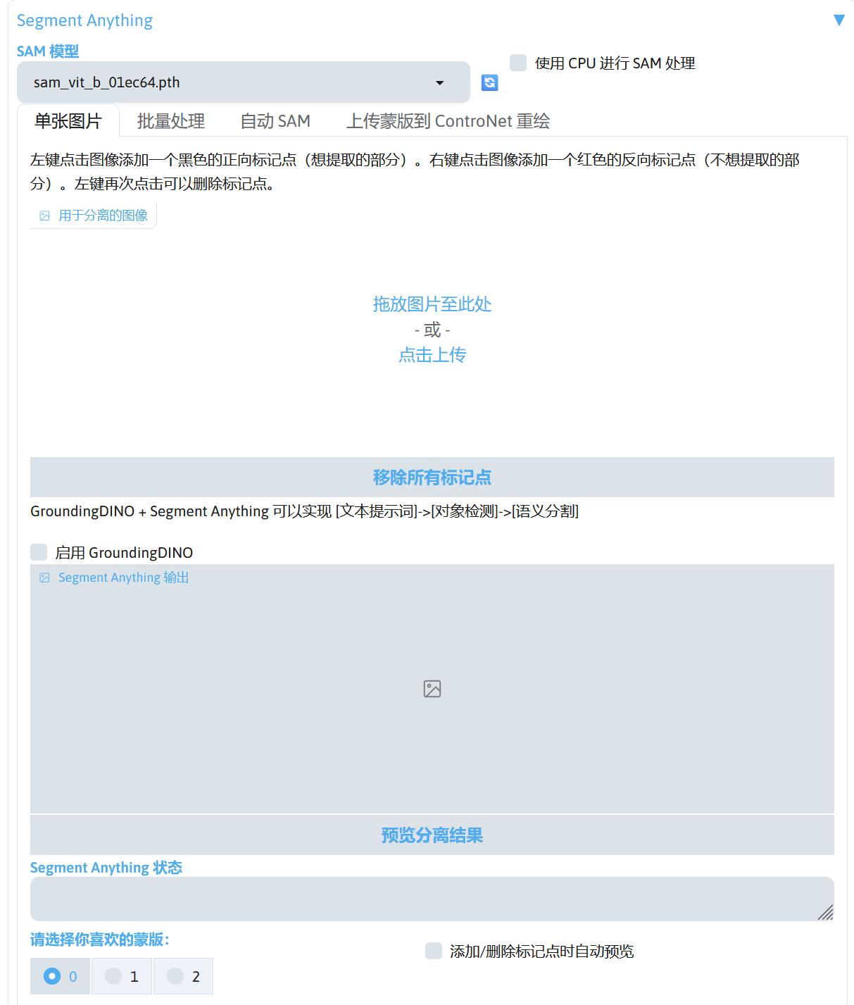安装该扩展后,在文生图或者图生图界面可以看到 Segment Anything 选项。