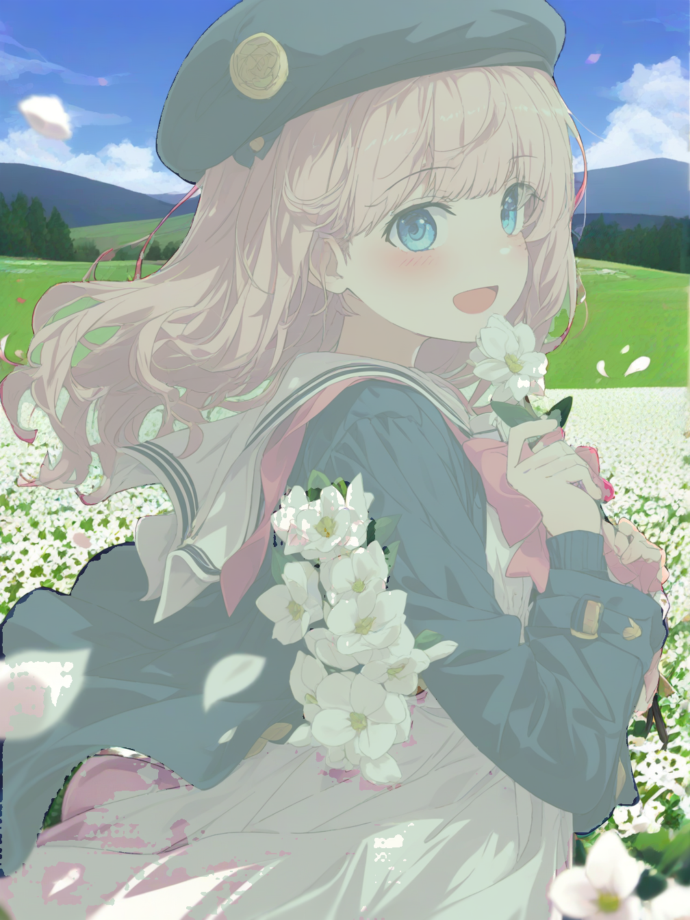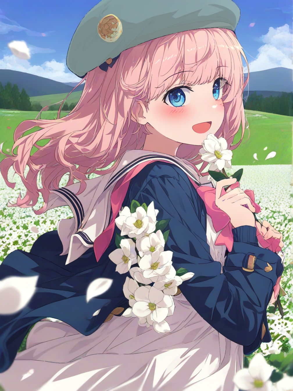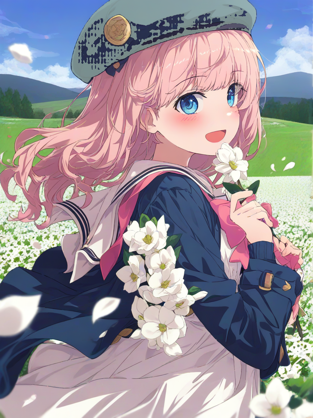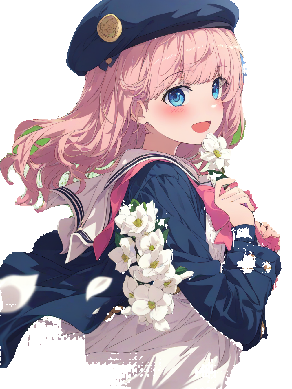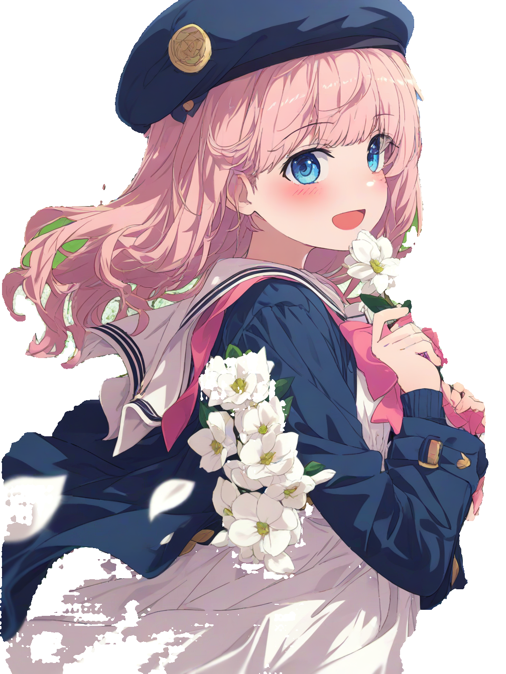 1girl,solo,long hair,pink hair,bangs,blue eyes,blush,sailor collar,pink bow,long sleeves,dress,white dress,jacket,blue jacket,blue headwear,bow,open clothes,hair flower,hair ornament,head wreath,