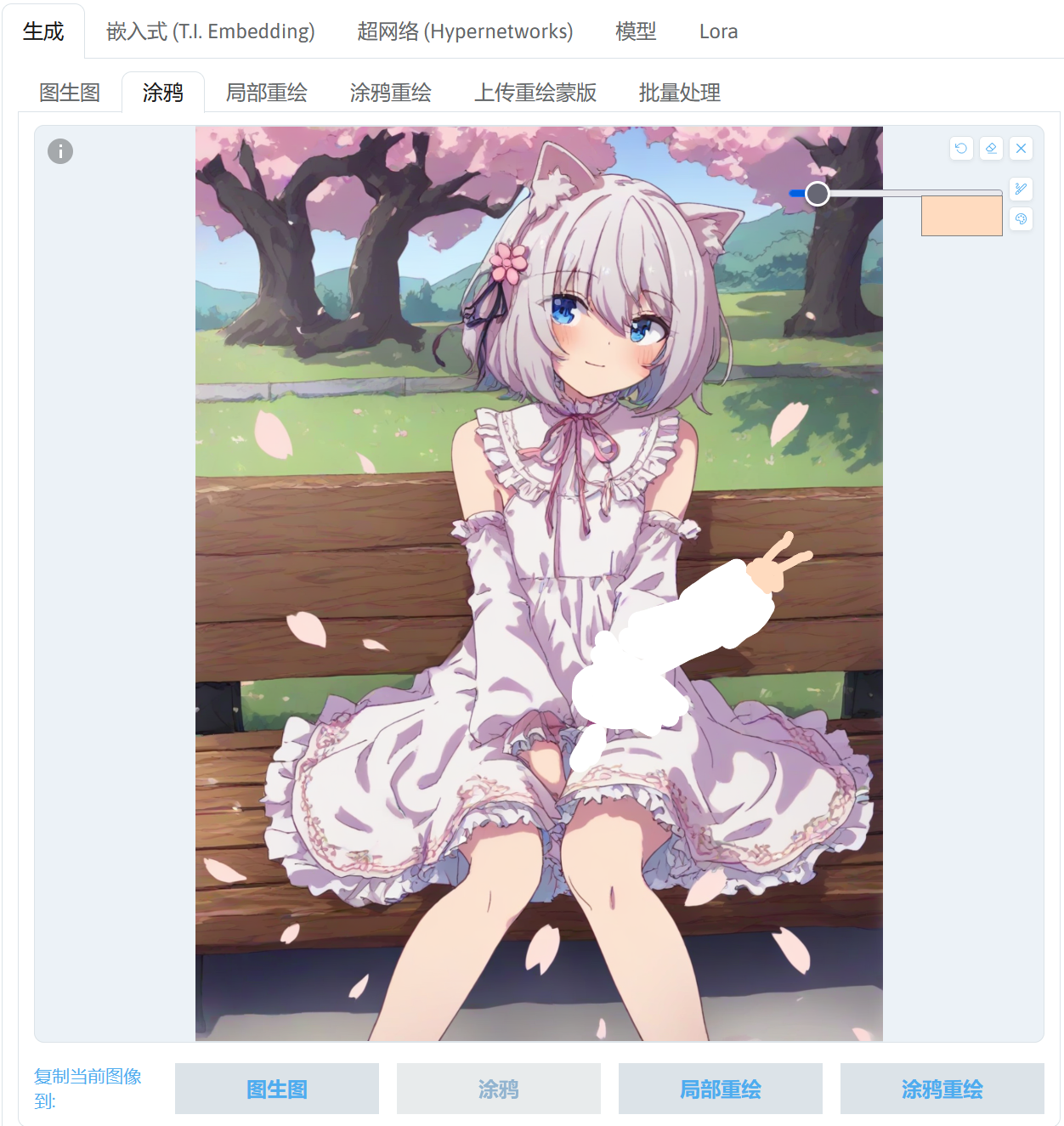 | 涂鸦 | 在这个模式中将拥有一个可以调色的画笔,可对导入的图片进行涂鸦,再进行图生图。可以导入一张白色图片,在上面进行简单的涂鸦,再通过图生图将涂鸦转换为想要的内容;或者配合局部重绘,先在涂鸦模式下对想要修改的元素进行简单的涂鸦,再将涂鸦后的图片发送到局部重绘中,将涂鸦的部分画上蒙版,通过图生图的方式修改图片中某个地方的元素。SD WebUI 内置的涂鸦功能较为简陋,可使用 PhotoShop、GIMP、Krita 等专业软件在图片上进行涂鸦,涂鸦完成后再导入 SD WebUI 中。 |