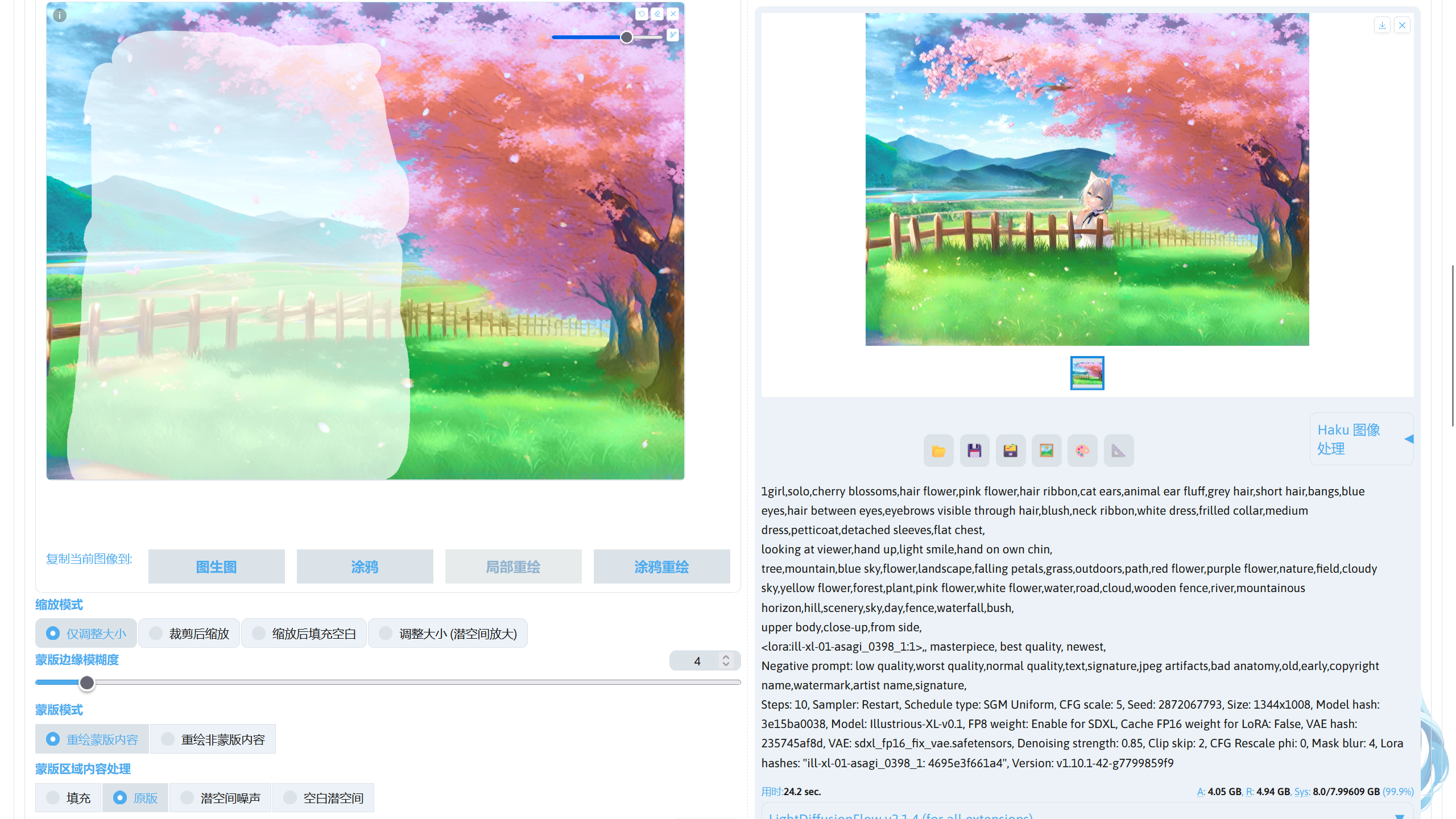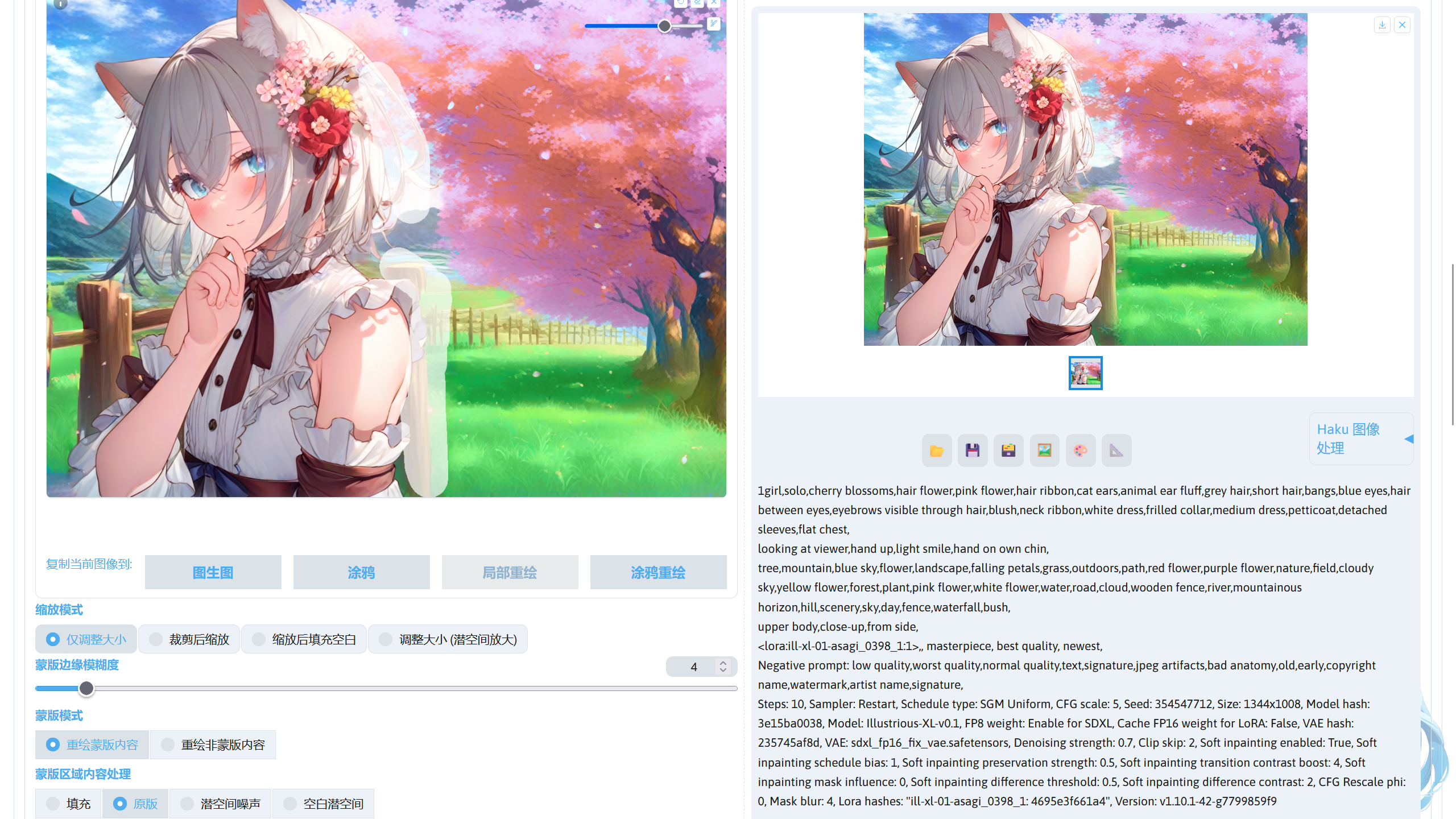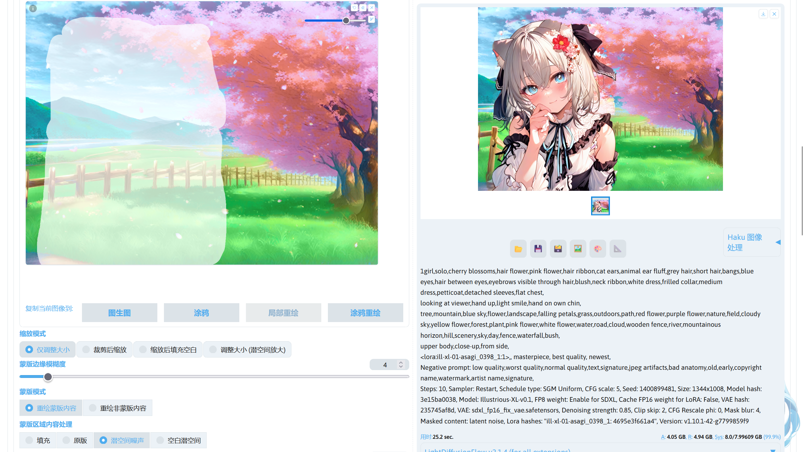 提示词中的画风 LoRA:ill-xl-01-asagi_0398_1(Civitai),模型放在stable-diffusion-webui/models/Lora。