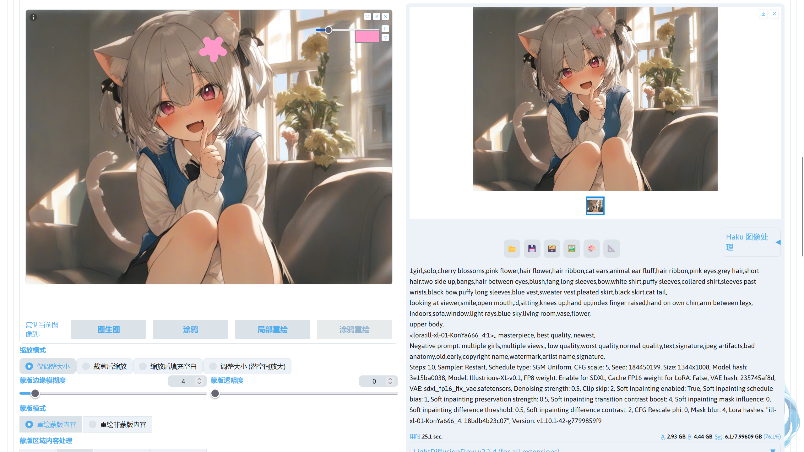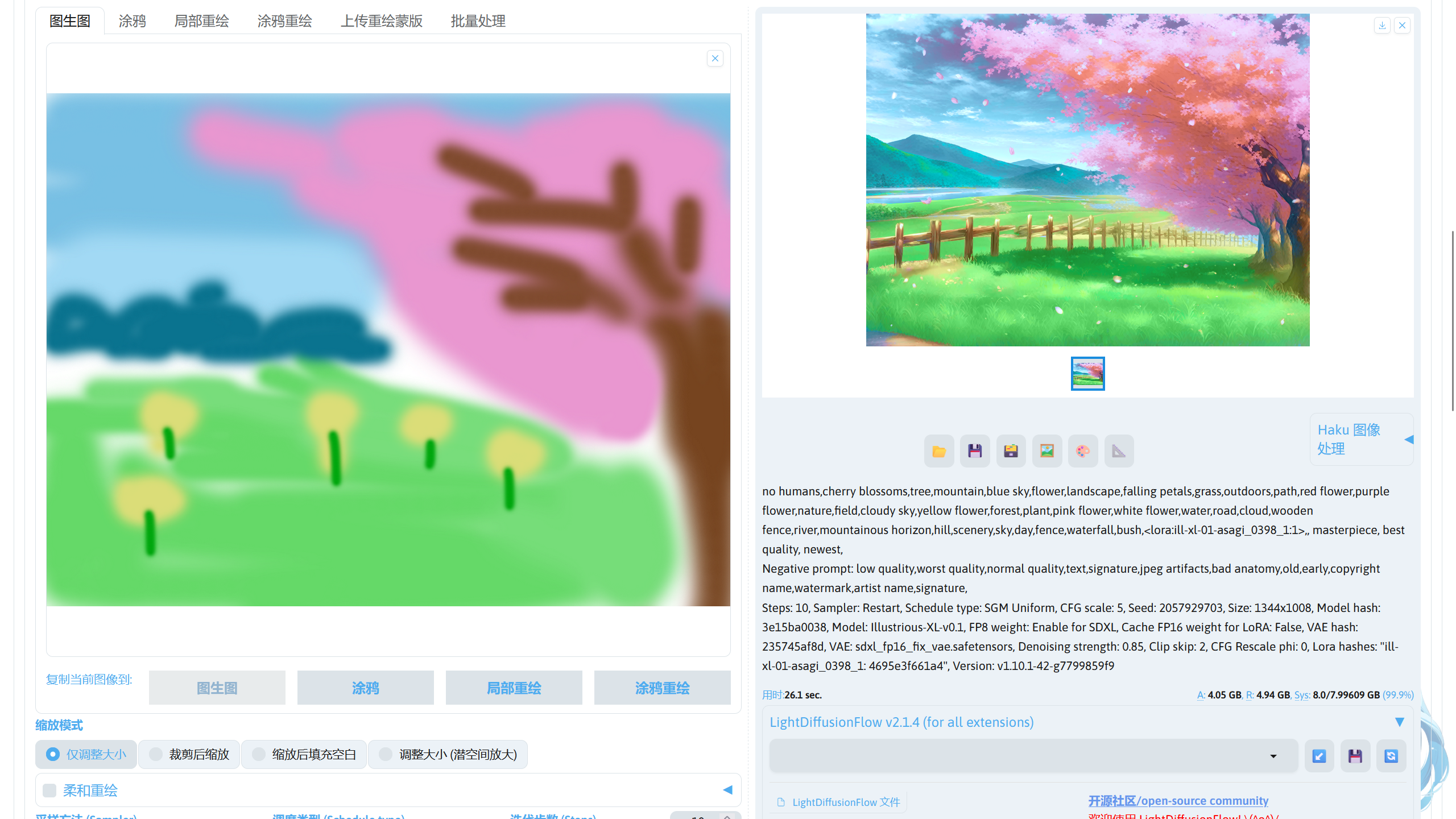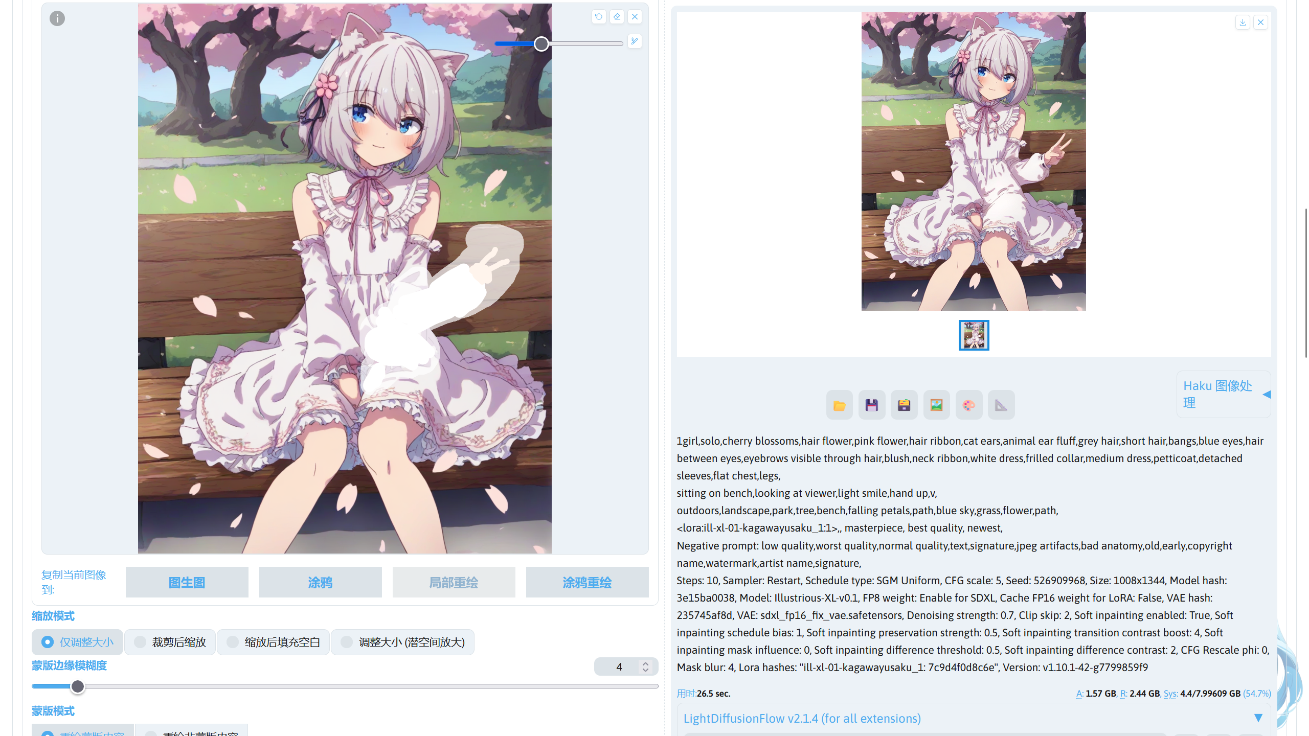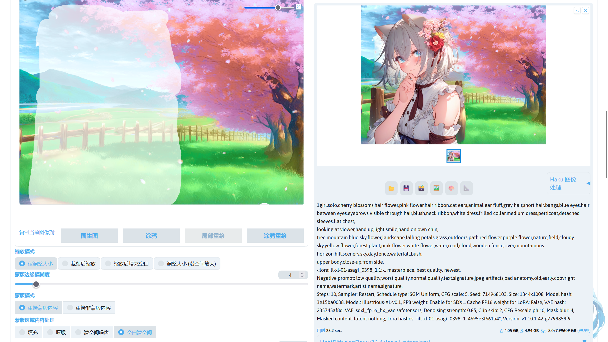 提示词中的画风 LoRA:ill-xl-01-asagi_0398_1(Civitai),模型放在stable-diffusion-webui/models/Lora。