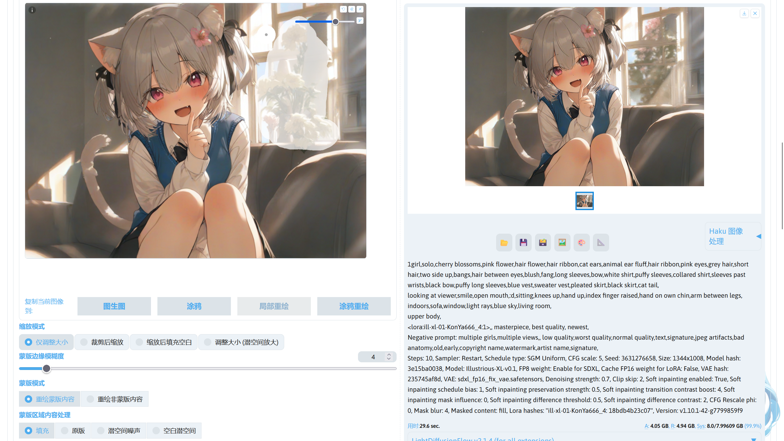 图生图需要将原图反推为潜空间数据,因此占用会比文生图更高,并且参考图尺寸越大占用越高。对于局部重绘,占用会比单纯图生图再略高,但这并不意味着低显存就不能局部重绘,实际上只要采用将重绘区域裁剪下来的方法就可以实现低显存重绘。并且由于图生图会经过两次 VAE,在使用 VAE 异常的模型时,每次重绘都会导致画面变得更灰,反复迭代将灰到不能看,最好保持外挂 VAE。