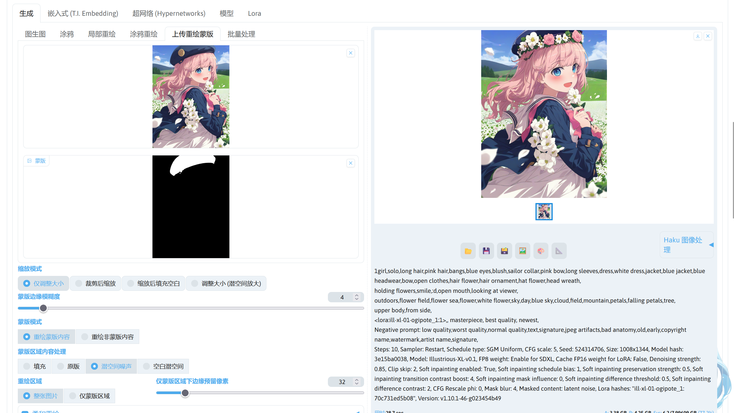 现在挑选其中一个蒙版并下载,然后进入图生图界面中,在上传重绘蒙版部分分别上传原图和蒙版,将蒙版区域内容处理改为潜空间噪声,重绘幅度设置为 0.85,勾选柔和重绘,再写上对应的提示词进行描述。