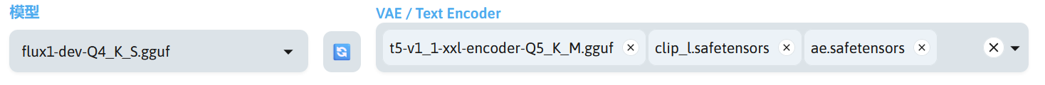 现在调整一下生图参数,使用 flux1-dev-Q4_K_S.gguf、t5-v1_1-xxl-encoder-Q5_K_M.gguf、clip_l.safetensors、ae.safetensors 模型,以下为我为 FLUX 模型设置的参数。