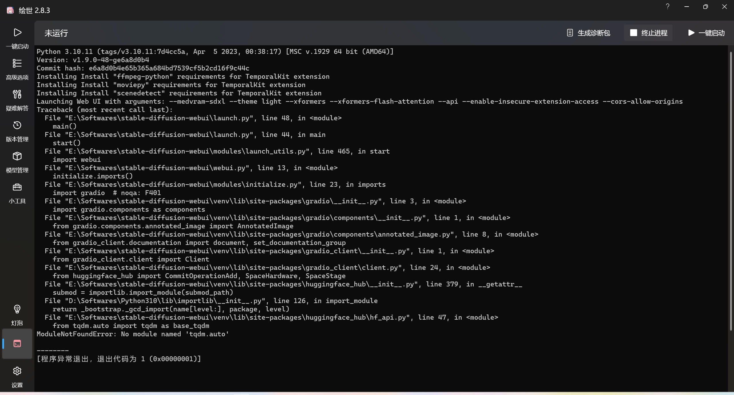 这里提示 No module named 'tqdm.auto',翻译过来就是缺少一个叫 tqdm.auto 的模块。如果这个报错看不懂,可以在绘世启动器的疑难解答中扫描一下。