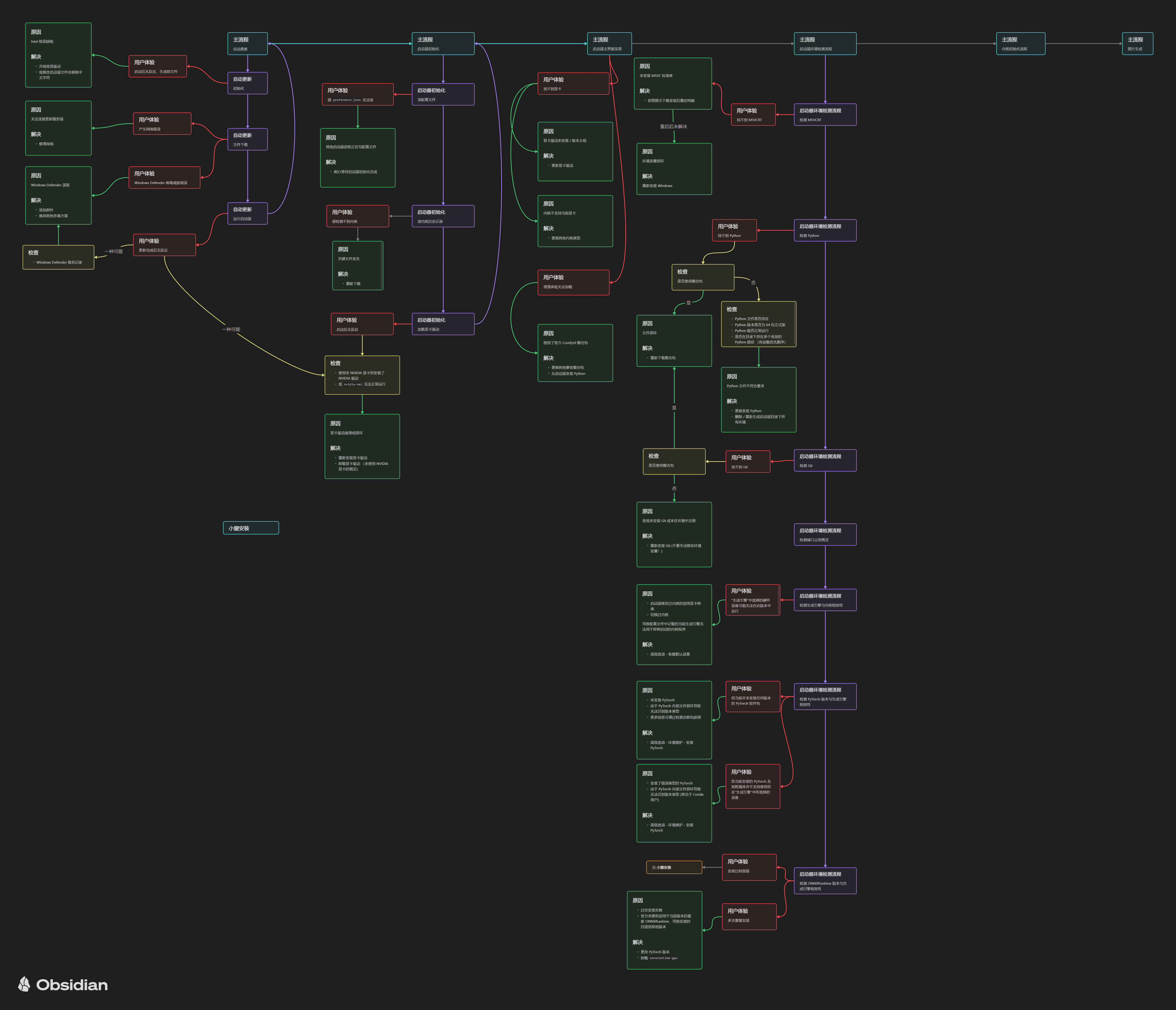下图展示了绘世启动器的启动流程,列举了可能产生的问题和对应的解决方法。